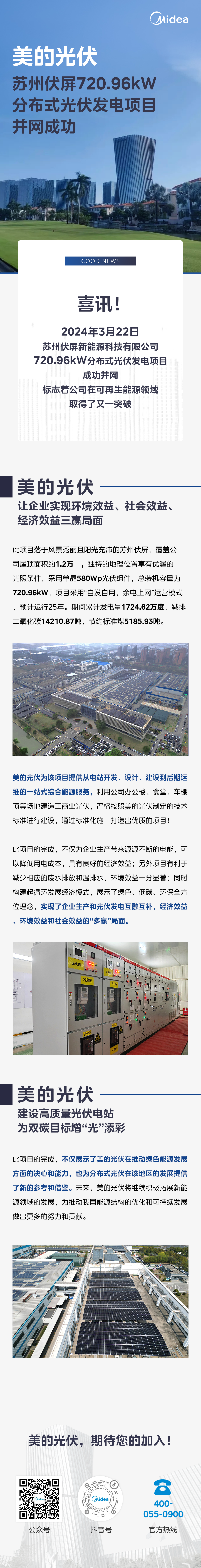 美的光伏苏州伏屏720.96kW分布式光伏发电项目并网成功